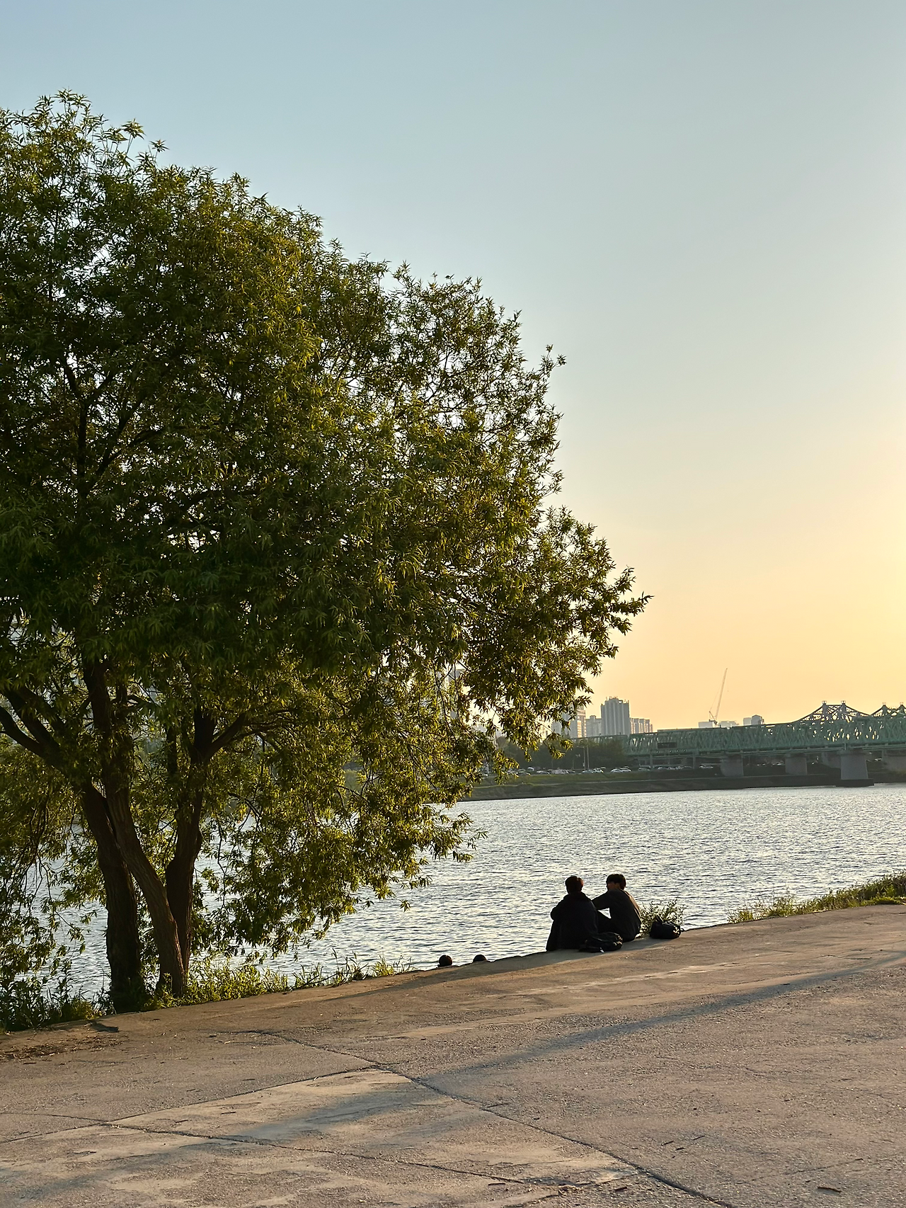걷다 보니 긴 벤치 끝에 빈자리가 보여, 한쪽 끝에 앉아 있던 분들과 합석했다. 잠시 책을 읽었다. 맞은편에서 부서지는 윤슬이 눈부셔 고개를 들기 어려울 정도였다. 조금 뒤엔 내 옆에 또 다른 분이 앉아 그분도 책을 읽었다. 그 장면이 너무나 평화로웠다.
