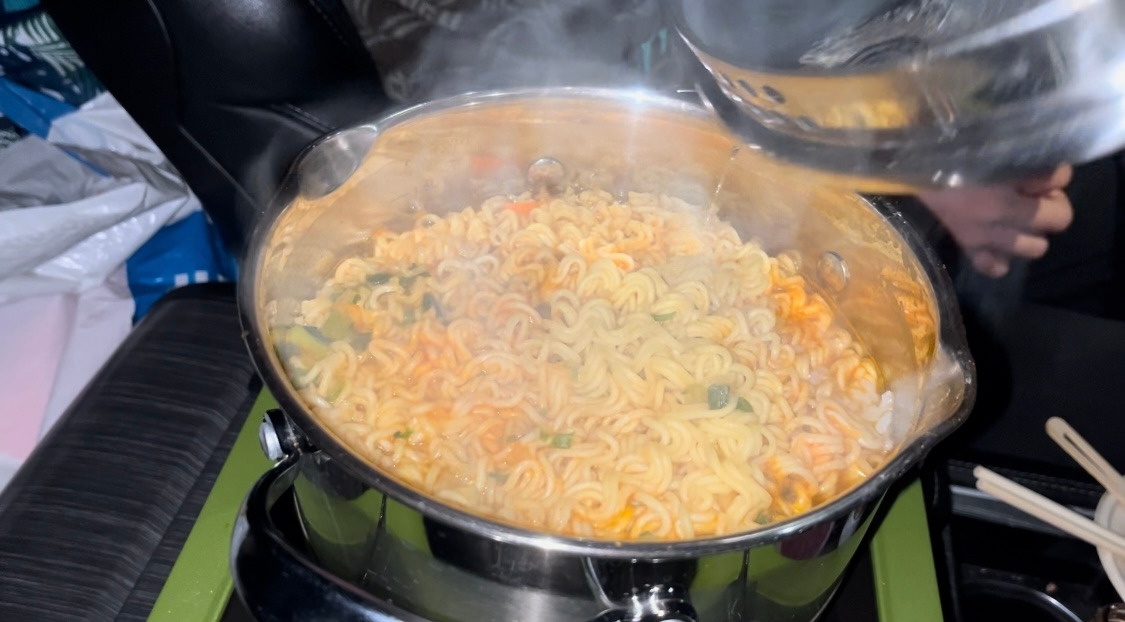 차 안은 따뜻해서 물이 금방 끓었고, 우리는 삼양라면 2개를 끓였다.