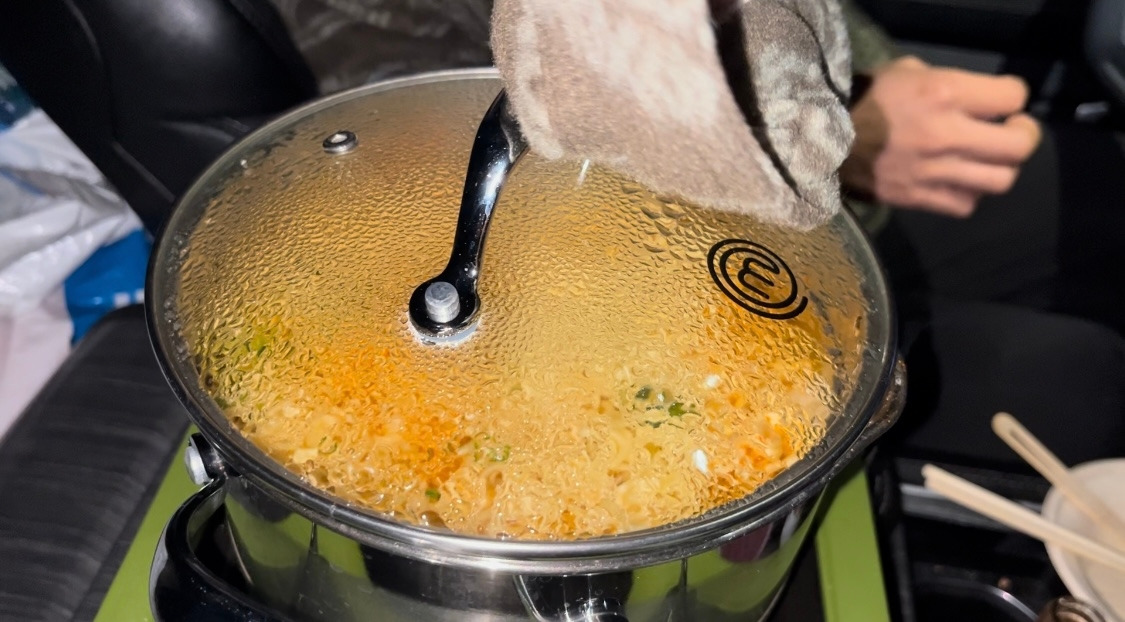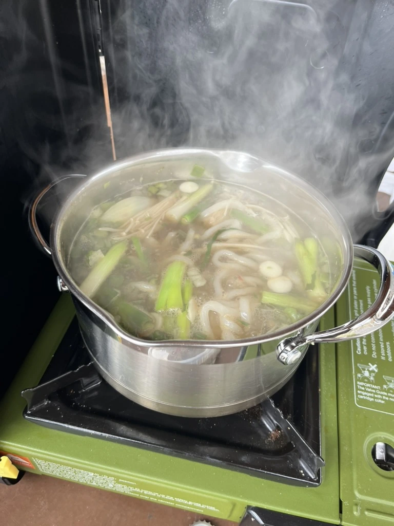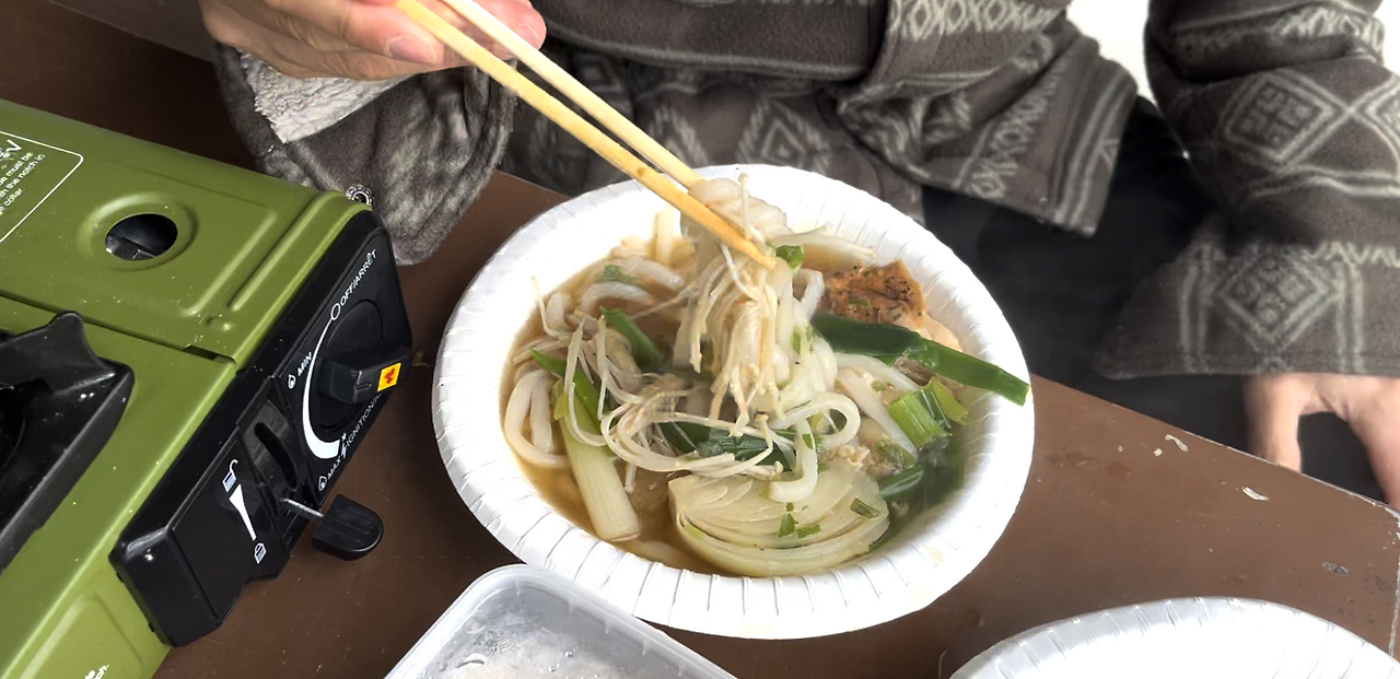우리는 피크닉 테이블 위에 놓인 도구들을 활용해 바람을 최대한 막으며 우동을 끓였다. 함께 준비한 우동 국물에 마트에서 사 온 닭구이를 곁들이니, 이 추운 날씨 속에서 한입 한입이 정말 꿀맛이었다. 따뜻하고 담백한 우동 한 그릇이 추위를 잊게 해주는 최고의 위로였다.