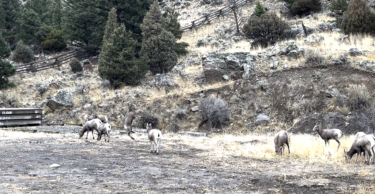 그 무리 중 대장으로 보이는, 길고 구부러진 뿔을 가진 산양이 있었다. 그런데 다리가 부러졌는지 한쪽 다리가 90도로 꺾인 채 절뚝거리며 걷고 있었다. 옆에서는 어린 산양 한 마리가 점프를 하며 다른 산양을 장난스럽게 툭툭 건드리는 모습도 보였다.