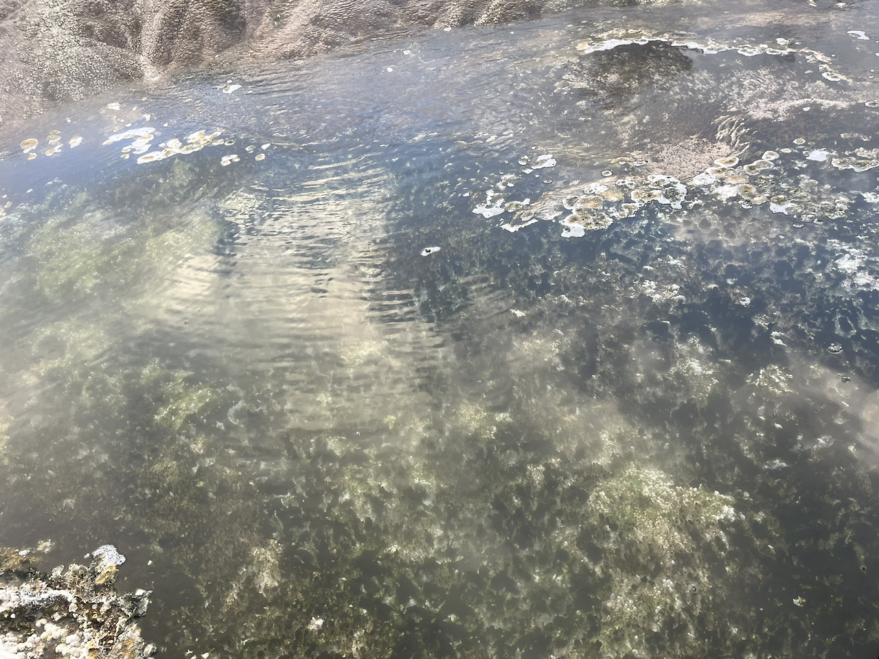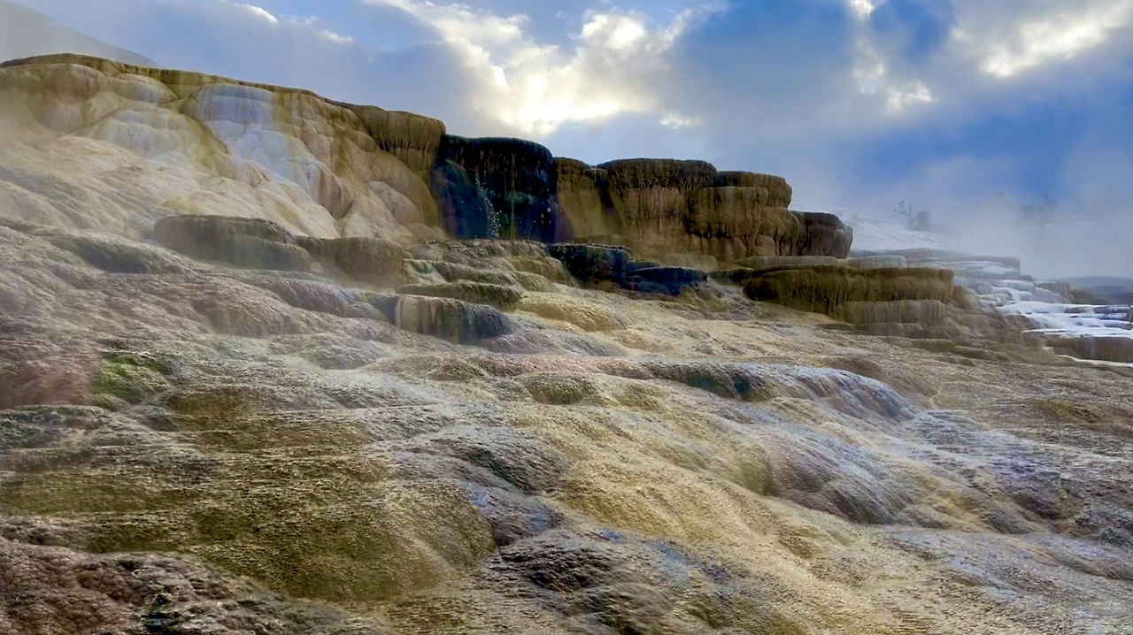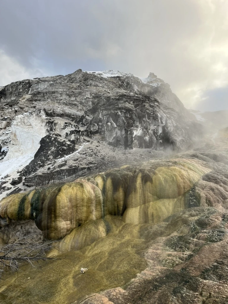 꼭대기까지 올라가니 Mammoth Hot Spring이라 불리는 자연 온천이 보였다. 계단식 지형을 이루며 뜨거운 온천수가 자연스럽게 흐르는 장관은 정말 처음 보는 광경이었다. 짝꿍에게 이 물을 만져보고 싶다고 말하자, 짝꿍도 “그래, 만져보자”라며 물 쪽으로 다가갔다. 그런데 공기는 차가운데 물은 뜨거운 탓인지 신기하게 생긴 이끼들이 표면을 덮고 있었다.