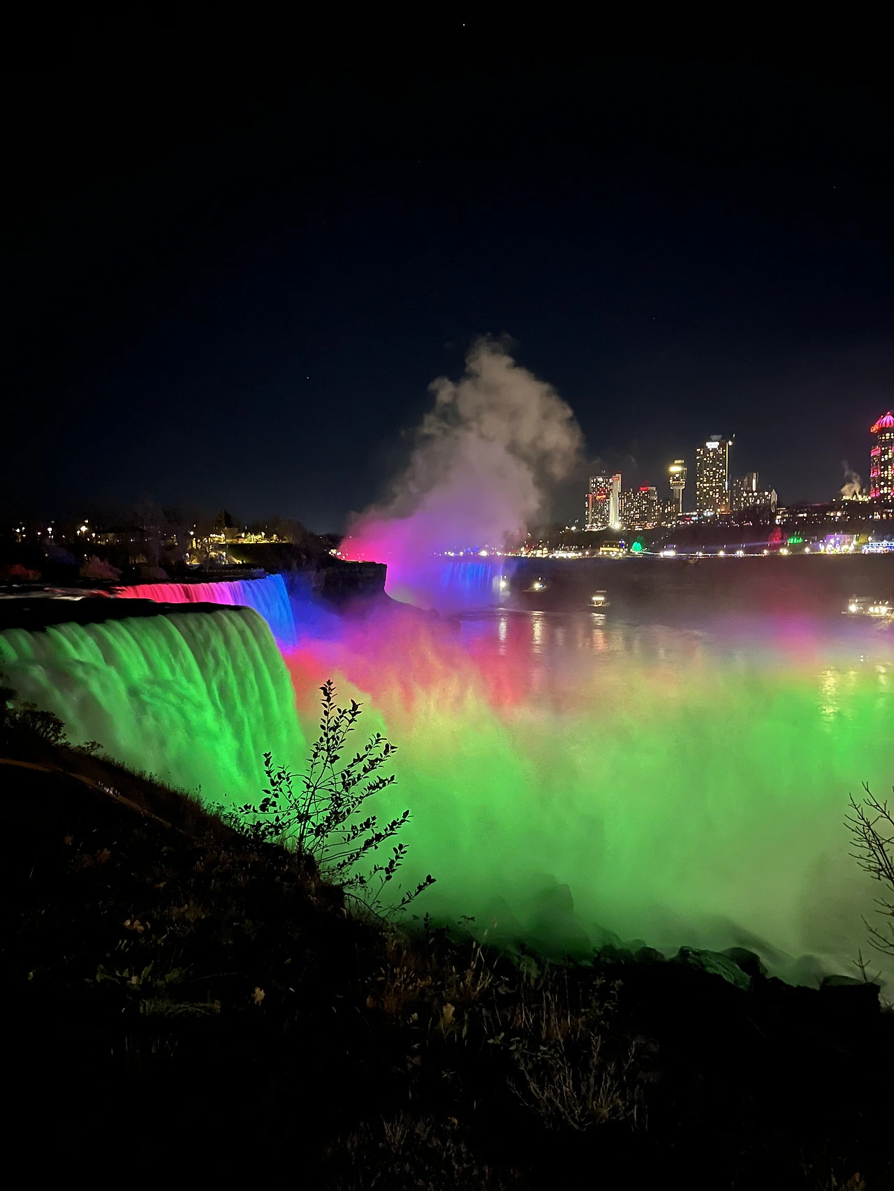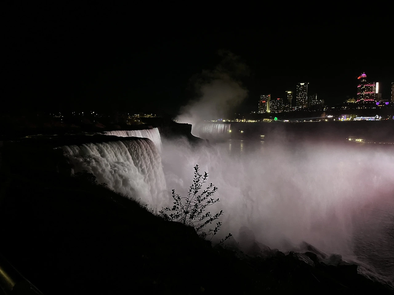 여러 불빛으로 물드는 나이아가라 폭포는 여전히 웅장하고 아름다웠다. 물론 캐나다 쪽에서 보는 풍경이 더 멋지지만, 미국 쪽에서도 자연의 경이로움을 충분히 느낄 수 있었다. 폭포 윗부분에서 쏟아지는 거대한 물줄기는 마치 인간이 절대 만들어낼 수 없는 자연의 걸작 같았다.