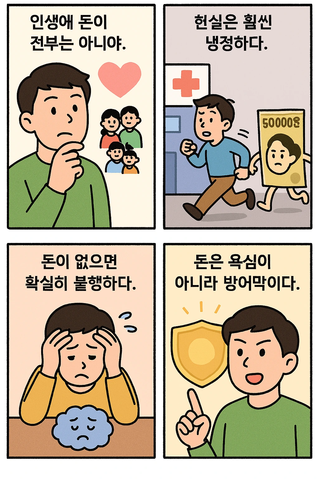그래서 우리는 돈을 다시 바라봐야 해요. 돈을 단순히 욕심이나 허영의 상징으로만 보는 시선에서 벗어날 필요가 있어요. 돈은 욕심의 도구가 아니에요. 오히려 돈은 나와 내 가족을 지켜주는 방어막에 가까워요. 돈은 불행을 막아주는 안전장치예요. 삶의 위기를 줄여주고 불행의 확률을 낮춰주는 일종의 보호 장치인 거예요.