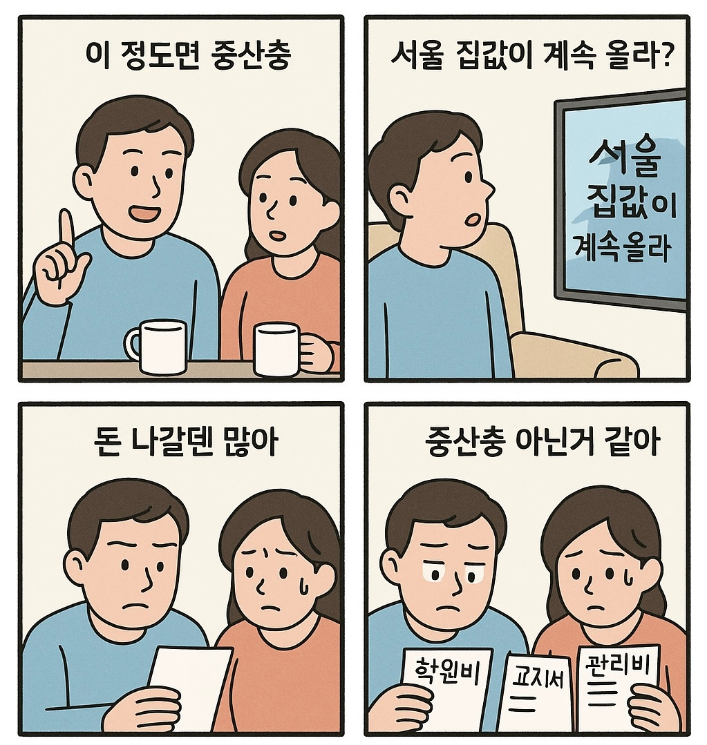 과거엔 월 400만 ~ 500만 원의 소득이 ‘중산층’으로 인정받았지만, 지금은 같은 소득을 받는 사람도 “살림살이가 빠듯하다”는 말을 쉽게 합니다. 이런 생활비 압박은 소득이 중위권에 있더라도 체감상 ‘중산층이 아니다’라는 생각을 하게 만듭니다.