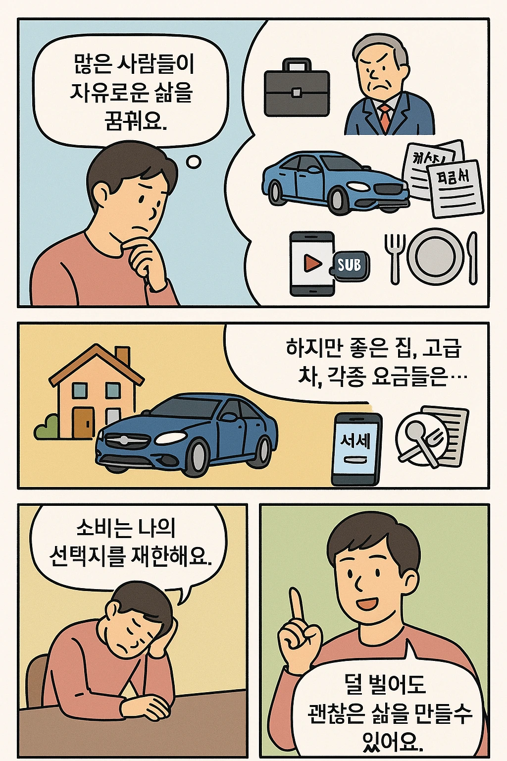 소비를 낮출 수 있다는 것은 곧 ‘덜 벌어도 괜찮은 삶’을 의미해요. 내가 선택할 수 있는 삶의 조건이 늘어나는 거예요. 꼭 월급이 높지 않아도, 자산이 많지 않아도 충분히 행복하고 안정적인 삶을 설계할 수 있어요. 그것이 바로 선택의 권한을 확보하는 첫걸음이에요.