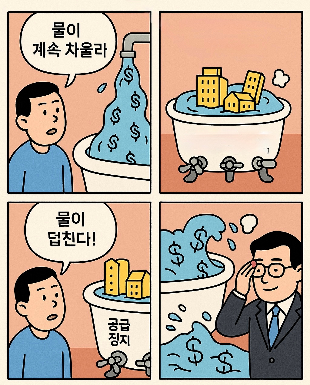 수도꼭지를 틀면 물이 계속 나옵니다. 그런데 욕조가 너무 작아요. 물이 넘칠 수밖에 없죠. 서울의 아파트가 좋아서가 아니에요. 돈이 많아져서 오르는 겁니다. 이런 상황에서 공급이 막히면? 당연히 가격은 오를 수 밖에요.