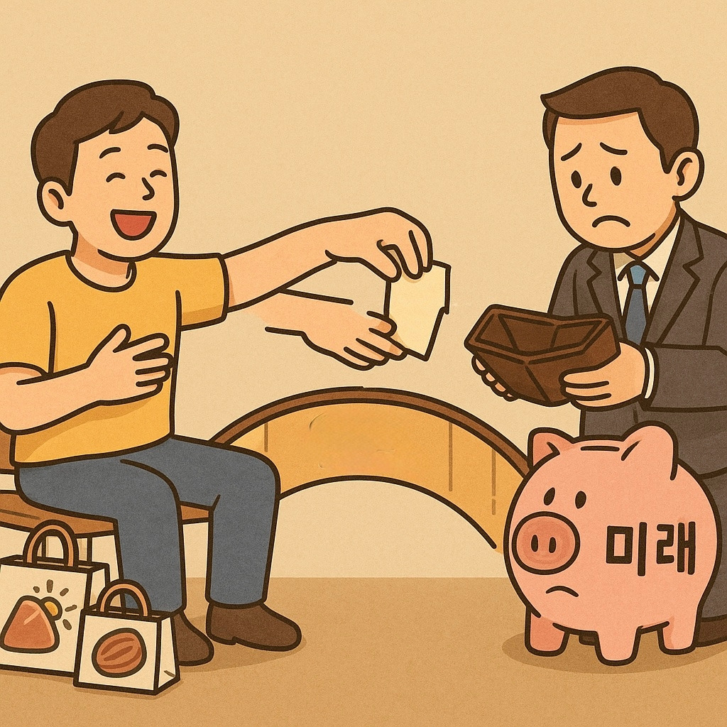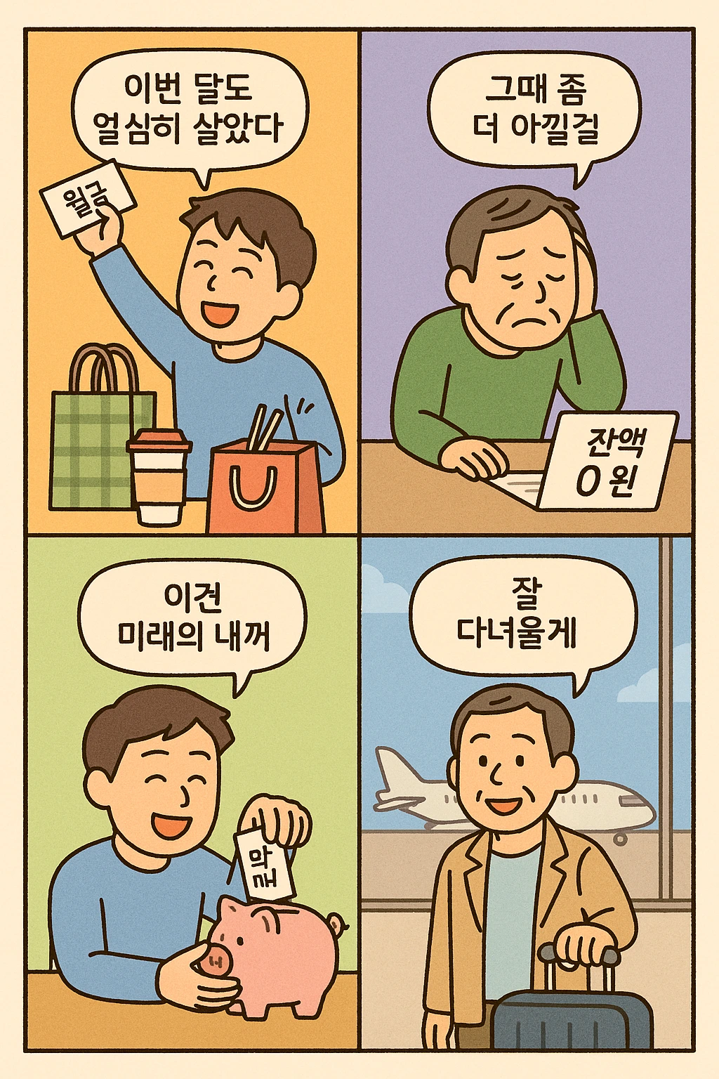 그래서 급여생활자가 이 함정에 빠지지 않으려면 소득의 타임라인을 나눠 생각해야 합니다. 지금의 월급은 ‘현재의 나’와 ‘미래의 나’가 함께 써야 하는 돈이라는 인식을 가져야 합니다. 현재의 내가 전부 써버리면, 미래의 나는 쓸 돈이 없으니까요.