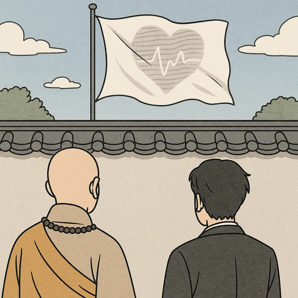 어느 날 주지스님은 담 너머 펄럭이는 깃발을 가리키며 “자네는 저 깃발이 왜 흔들린다고 생각하나”라고 묻는다. 답을 알 길이 없던 혼마 무네히사가 “바람이 불어대니 흔들리는 거죠”라고 건성으로 대답하자, 스님은 “저 깃발이 흔들리는 건 자네 맘이 흔들리기 때문이네”라고 말한 뒤 사라졌다. 결국 흔들리는 마음이 문제였다.