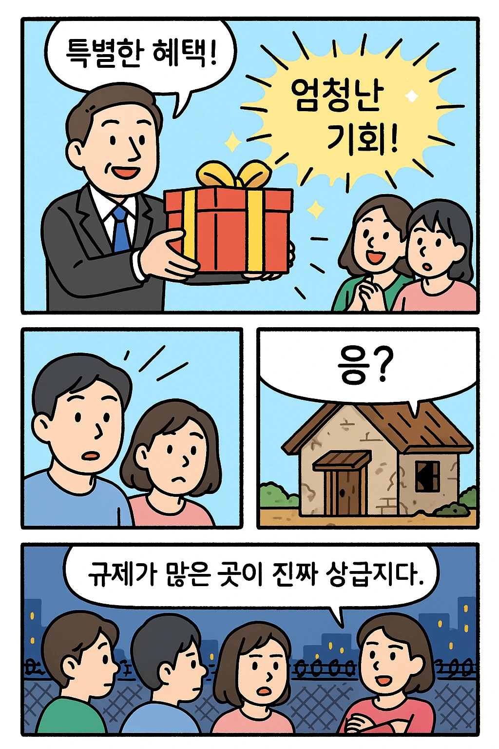 냉정히 말해 그런 곳은 인구가 줄고, 산업이 쇠락하고, 집값 상승의 동력이 거의 없는 지역입니다. 규제를 풀어줘도 오를 힘이 없는 땅이니까, 혜택을 주는 겁니다.