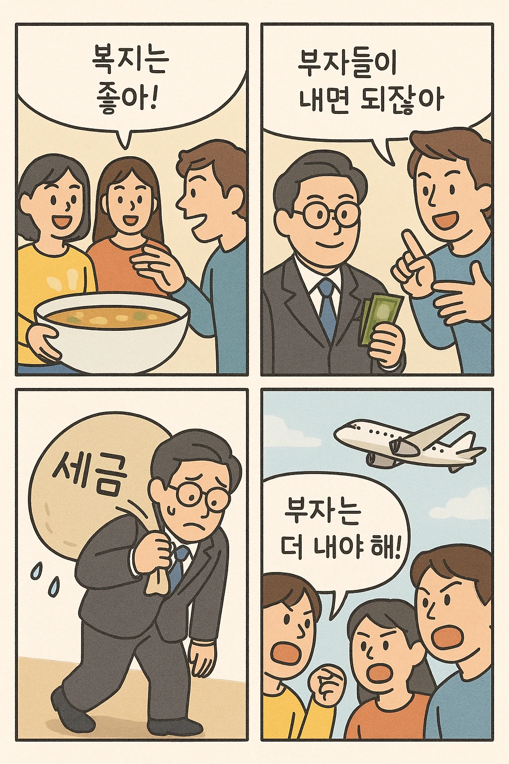 대신 정치권은 “부자에게 세금을 더 물리자”라는 단순한 구호를 반복해왔습니다. 세금을 내지 않는 다수는 손쉽게 동의했고, 세금을 내는 소수는 점점 비난의 대상이 되었습니다. 이게 민주주의라면 할 말은 없습니다만, 우리 사회가 성장 동력을 잃고 있는 원인 중 하나입니다. 갈라치기를 하며 사회는 점점 변화하고 있습니다.