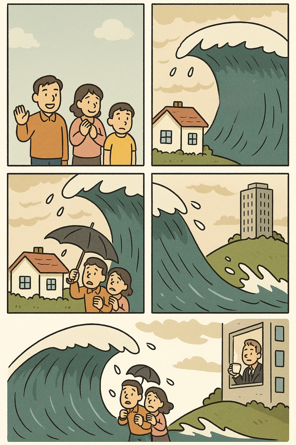 하지만 서민은 정반대입니다. 소득에서 식비와 주거비가 차지하는 비중이 크기 때문에 물가 상승이 곧 생활 위기로 이어집니다. 집값이나 월세가 오르면 더 이상 버틸 여력이 없어지기도 합니다. 가진 게 없으니 얻는 것도 없고, 잃는 것만 늘어나는 셈입니다. 악순환의 고리도 올라타면 빠르게 빨려 들어갑니다.