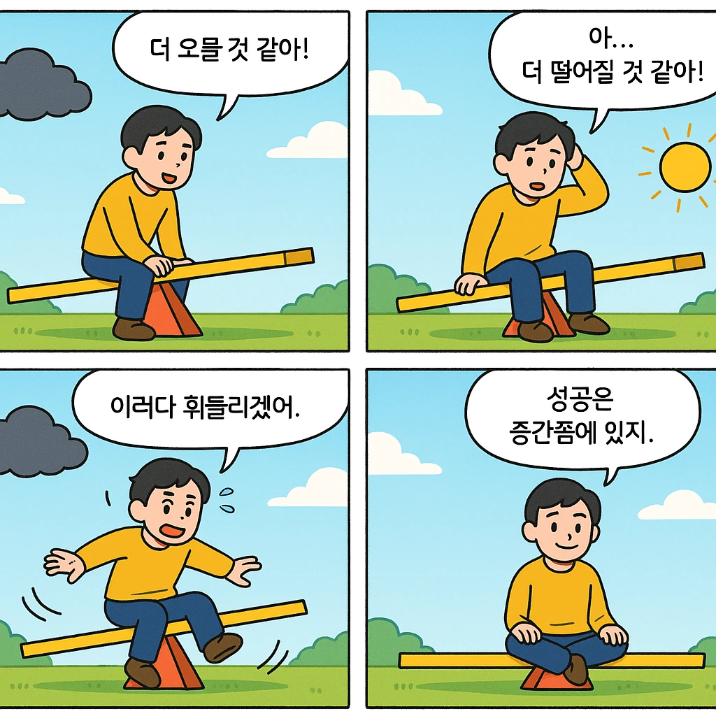 우리는 늘 극단에 끌리기 쉽습니다. 모두가 흥분해 있을 때 냉정을 유지하기 어렵고, 모두가 절망할 때 희망을 품기 힘듭니다. 하지만 역설적으로, 그 사이를 지켜내는 것이야말로 진짜 투자자의 태도이고, 삶의 균형을 지켜내는 비결입니다.