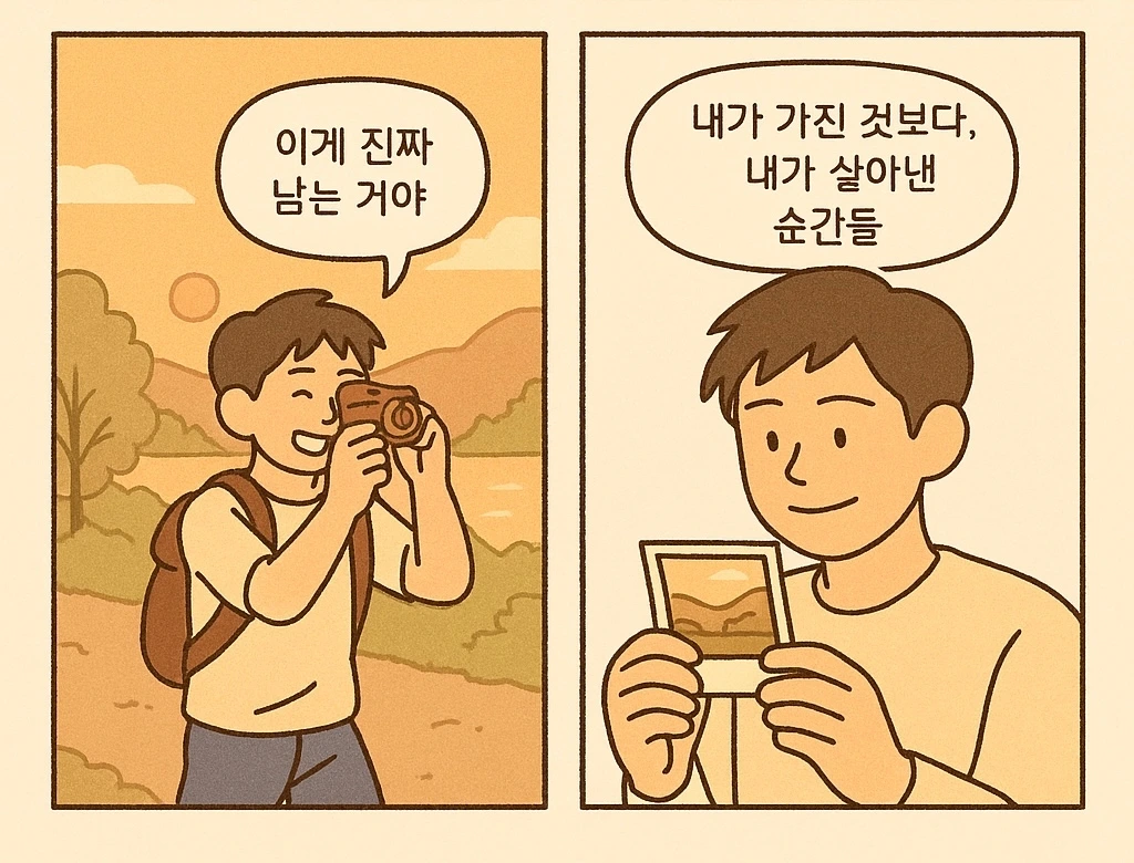 이제는 돈을 어디에 쓰느냐를 ‘소유냐, 경험이냐’라는 단순한 대비가 아니라 ‘나를 더 풍요롭게 만드는가’라는 질문으로 바라볼 필요가 있어요. 집을 사거나 차를 바꾸는 것도 중요하지만, 내 기억 속에 오래 남을 순간에 투자하는 것도 같은 무게를 가집니다.