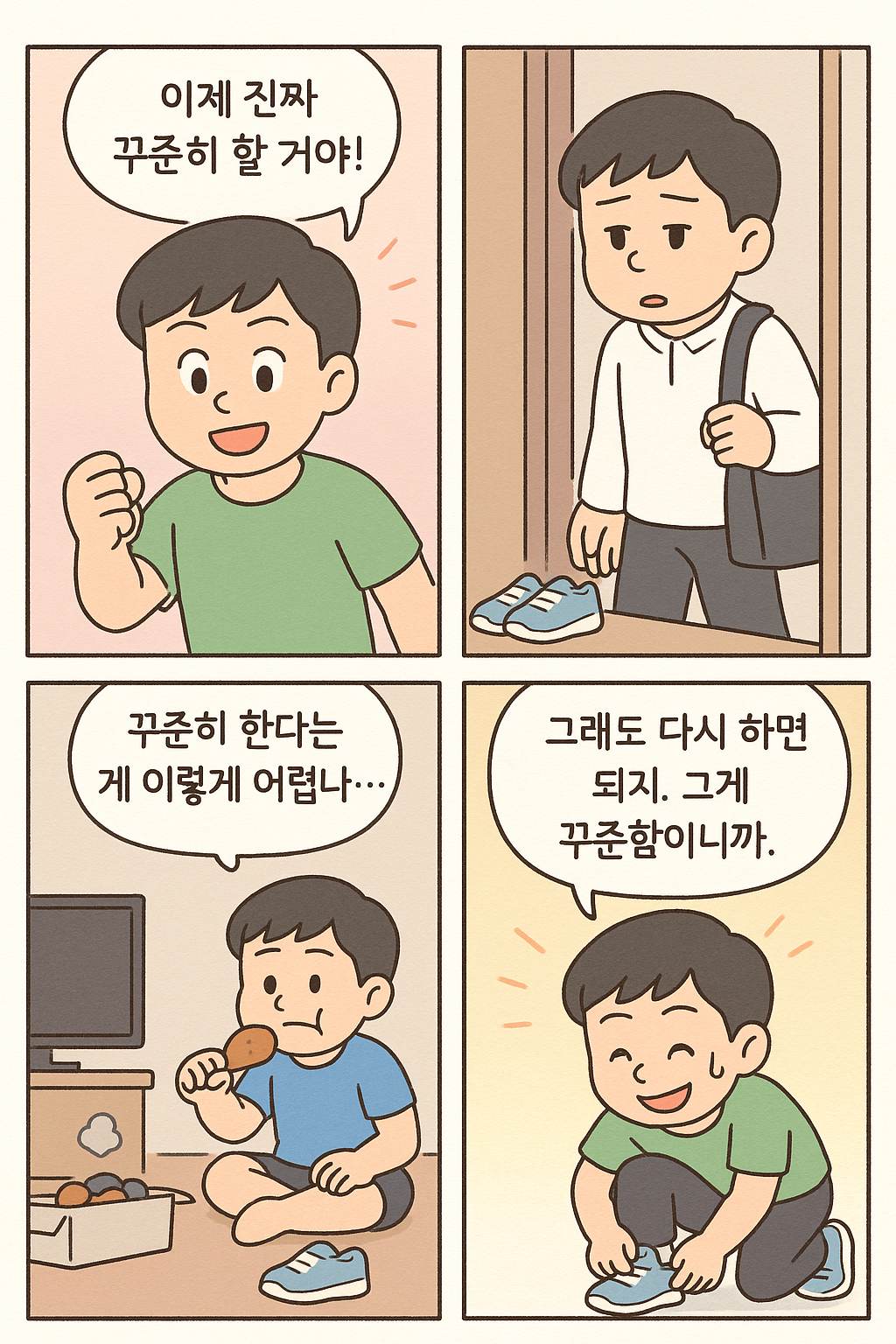 중요한 건 그다음 날입니다. 다시 시도할 수 있다면, 그것은 이미 꾸준한 사람의 길 위에 있는 것입니다. 꾸준함은 완벽한 연속이 아니라, 중간의 ‘멈춤’ 이후에도 다시 이어지는 끈기입니다. 포기하지 않는 마음이 꾸준함을 만들어갑니다.