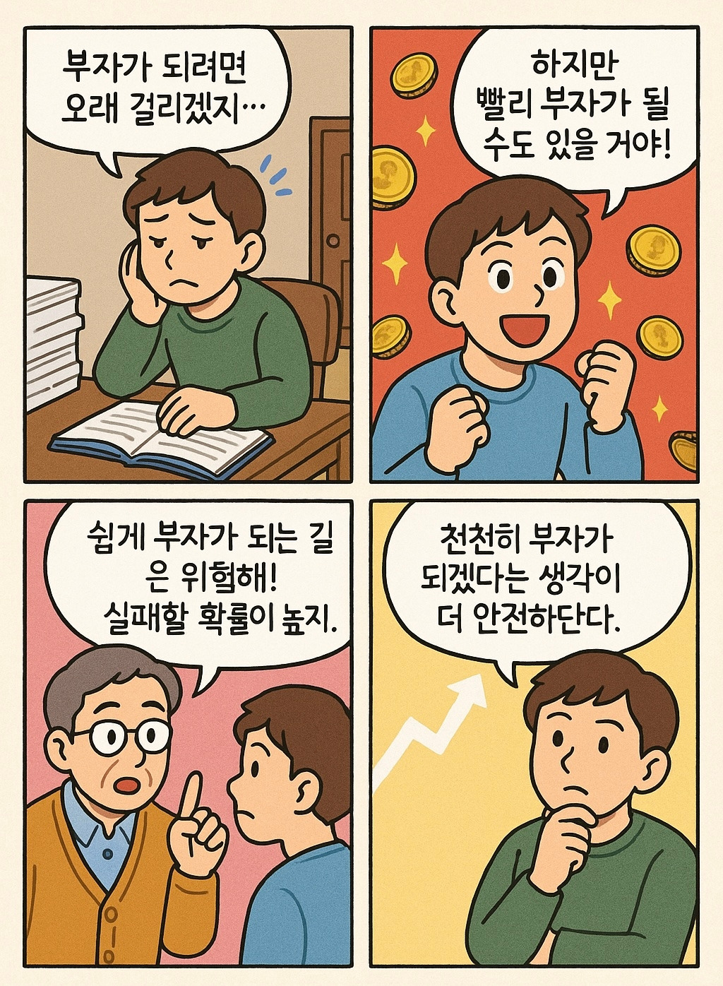 빠르게 부자가 된 사람들은 대부분 ‘집중’과 ‘극단적인 선택’을 경험했어요. 직장을 그만두고 창업을 하거나, 가진 돈을 코인이나 부동산에 몰아넣는 식이에요. 그들은 성공하면 엄청난 자산을 얻지만, 실패할 경우 그 대가도 큽니다.
