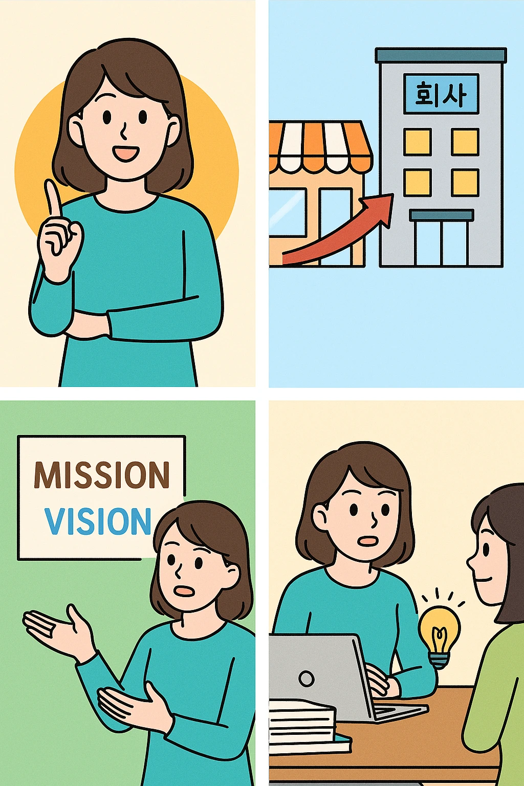 단순히 돈을 벌기 위해서만이라면 힘든 시기를 견디기 어려워요. 사업은 결국 ‘어떤 세상을 만들고 싶은가’에 대한 답이 있어야 해요. 이게 바로 사명(Mission)이에요. 그리고 그 사명을 통해 바뀔 세상의 모습, 그것이 비전(Vision)이에요.
