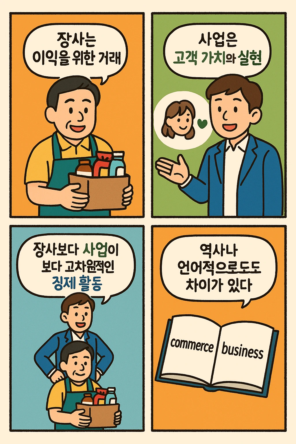 이러한 차이는 언어에서도 드러나요. ’장사(commerce)’의 어원은 라틴어 ’함께(com) + 거래(merc)’에서 왔어요. 함께 거래한다는 뜻이지만, 여전히 핵심은 ‘거래’예요.