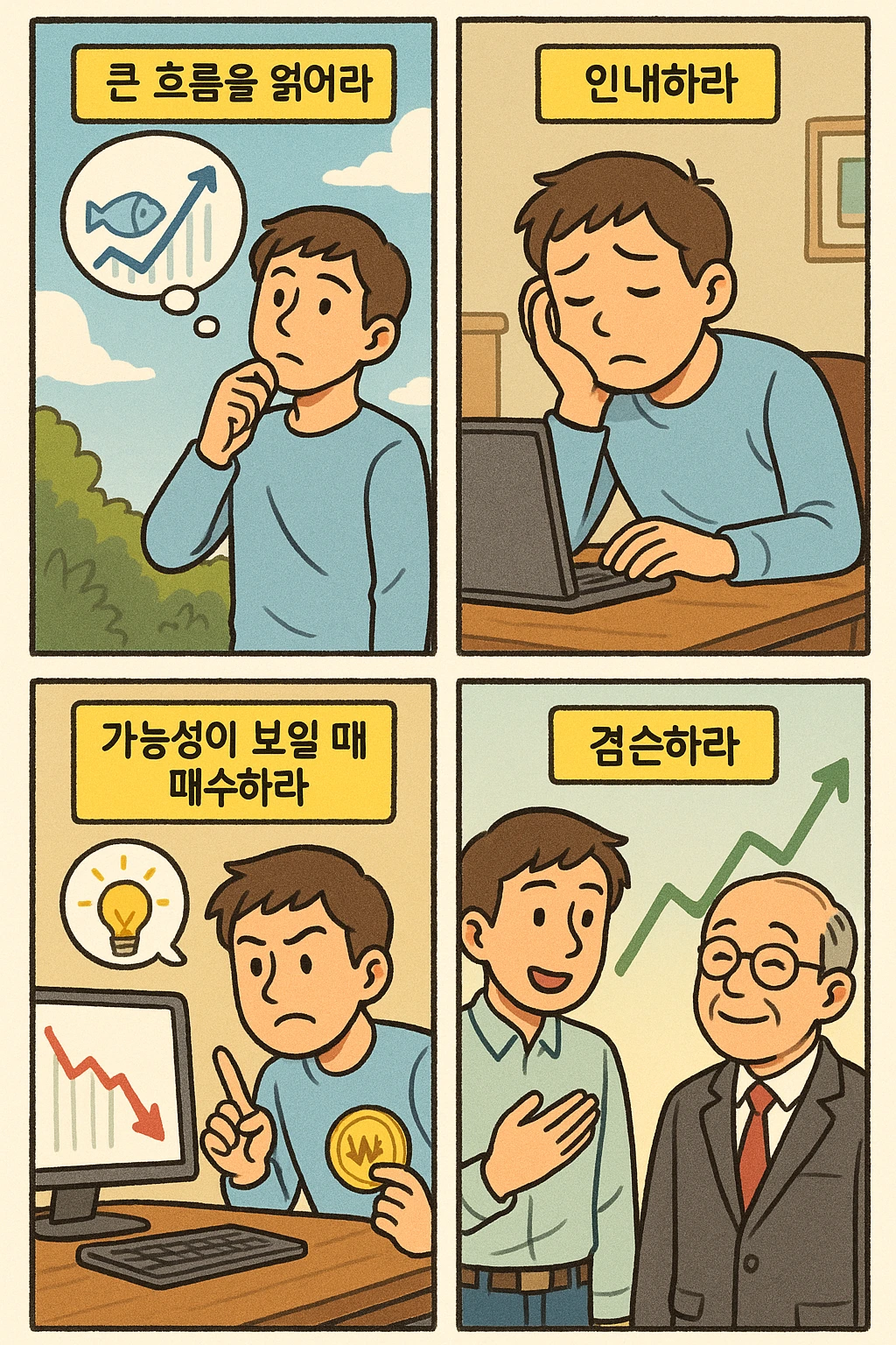 그렇다고 고집만 부려선 안 돼요. 다섯 번째 조언은 ‘유연함’이에요. 자신의 판단이 틀렸을 수도 있다는 것을 받아들이는 건 매우 어렵지만, 시장 앞에서는 자존심이 아니라 겸손이 필요해요. 잘못된 투자는 ‘손절’이라는 용기로 정리하는 게 더 큰 용기를 요구하죠.