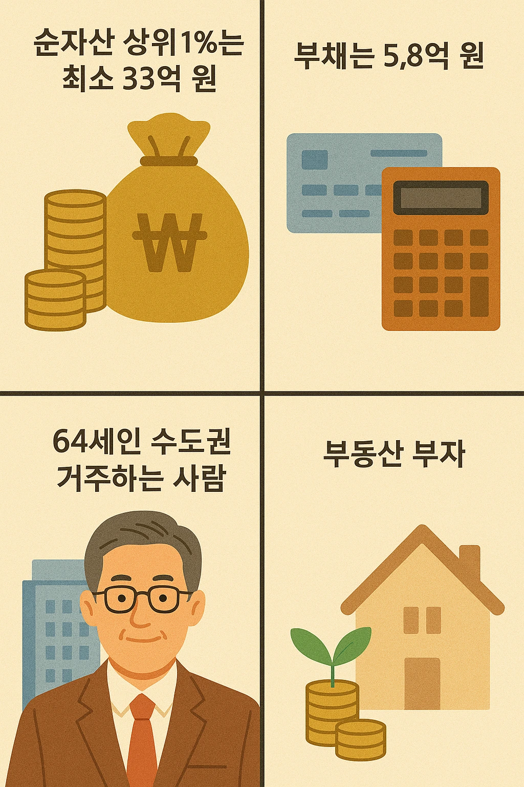 2024년 기준, 대한민국에서 순자산 상위 1%에 들어가려면 최소 33억 원의 자산이 필요해요. 평균적인 1% 가구는 55억 원의 순자산을 갖고 있고, 총자산은 61억 원, 부채는 5.8억 원 정도로 부채비율은 10%도 되지 않아요. 굉장히 안정적인 재무 상태죠. 이들은 대부분 수도권에 거주하고, 평균 가구주는 64세이며, 3인 가족 구성인 경우가 많아요.