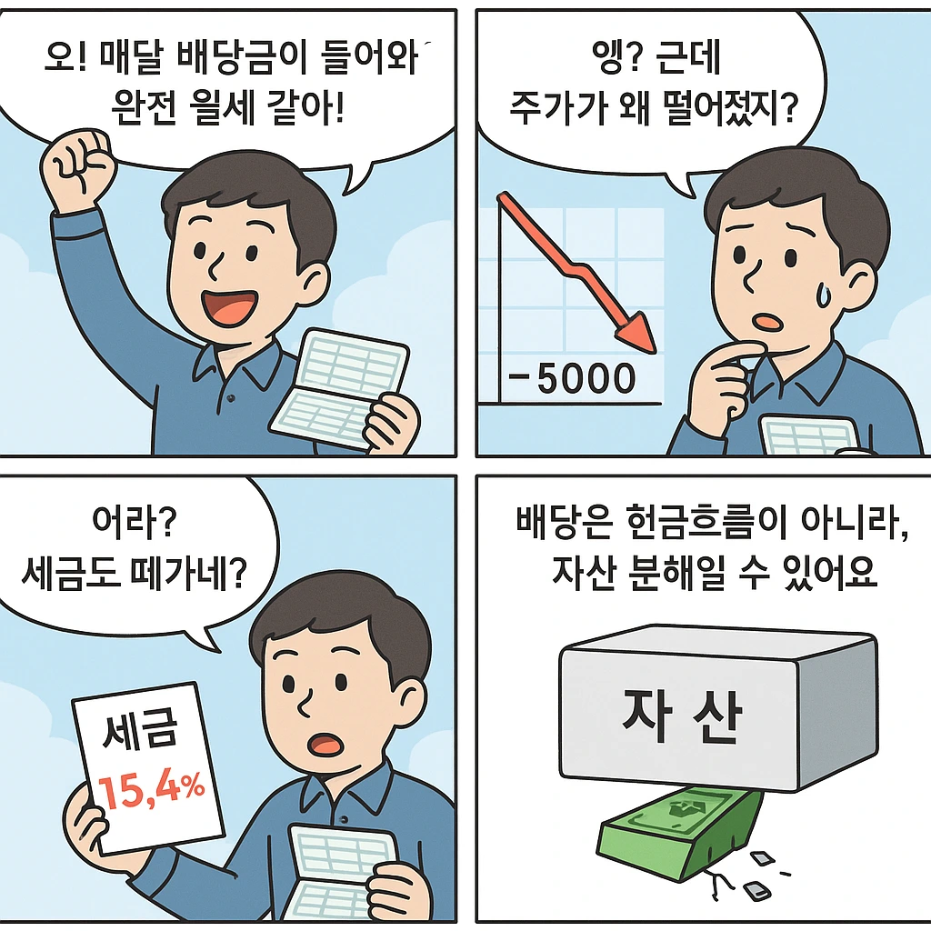 ‘배당소득’이라는 표현이 오해를 만들어요. 우리는 소득이라고 하면 새로운 수입을 떠올리지만, 실제로는 내 자산 일부를 현금으로 되돌려받는 것에 불과해요. 그 돈은 세금을 떼고, 다시 투자되거나 소비되죠. 전체 자산이 불어나는 건 아니라는 점에서, 진짜 의미 있는 소득은 아니에요.