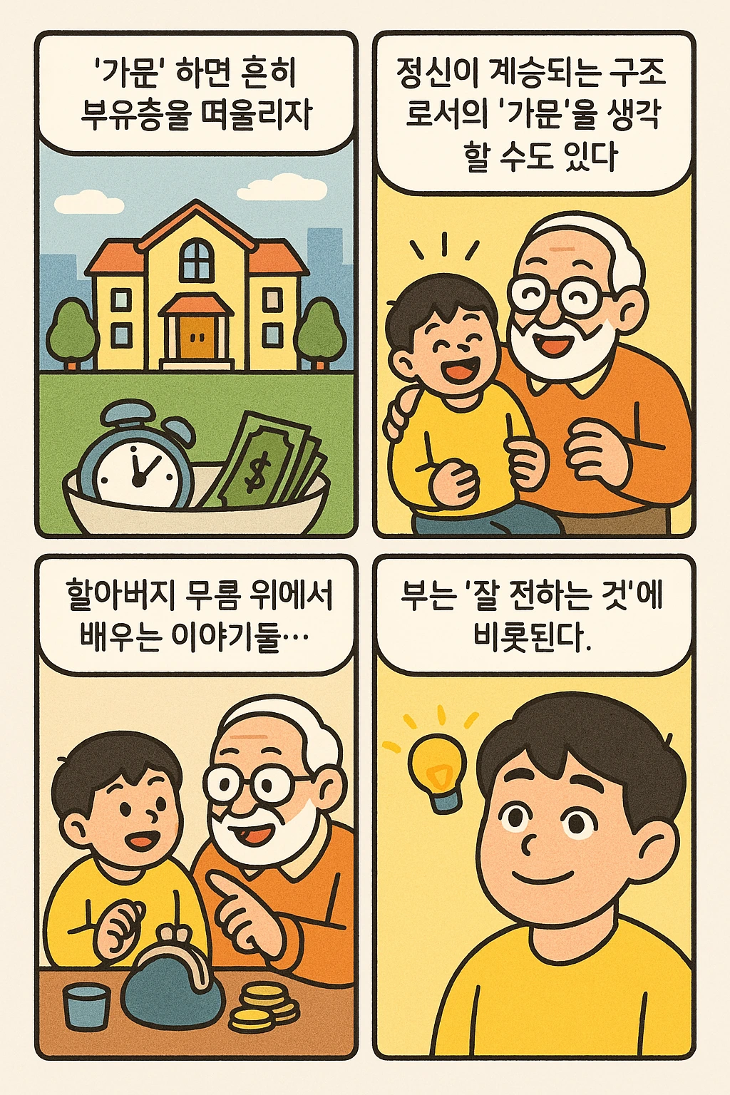결국 가문이라는 건 어떤 구조를 다음 세대에게 물려줄 수 있느냐에 대한 질문이에요. 재산을 얼마나 남길 수 있는가 보다 더 중요한 건 삶의 틀을 어떤 방식으로 설계해 주느냐예요. 오늘 내가 어떤 선택을 하느냐에 따라 내 아이가 살아갈 구조는 완전히 달라질 수 있어요.