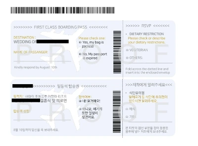 일가친척들과 손님들의 반응은 가히 폭발적이었다! 이런 청첩장은 처음 받아본다며, 데스티네이션웨딩의 기대감을 아주 잘 살렸다고 호평받았다. 날짜가 지나자 RSVP가 하나씩 도착했다. RSVP는 비행기 티켓 모양이니까 한 쪽을 점선에 따라 접으라고 하고 답신용 봉투도 그 크기에 맞춰 작은 걸 보냈었는데, 손님 중 하나는 봉투를 새로 사서 티켓 RSVP를 넣어서 보냈더랬다. 그 안에는 곱게 참석을 체크한 4장의 빳빳한 티켓과 쪽지가 들어있었는데, 쪽지에는 "RSVP가 너무 귀여워서 접을 용기가 나질 않았어" 라고 써 있었다.