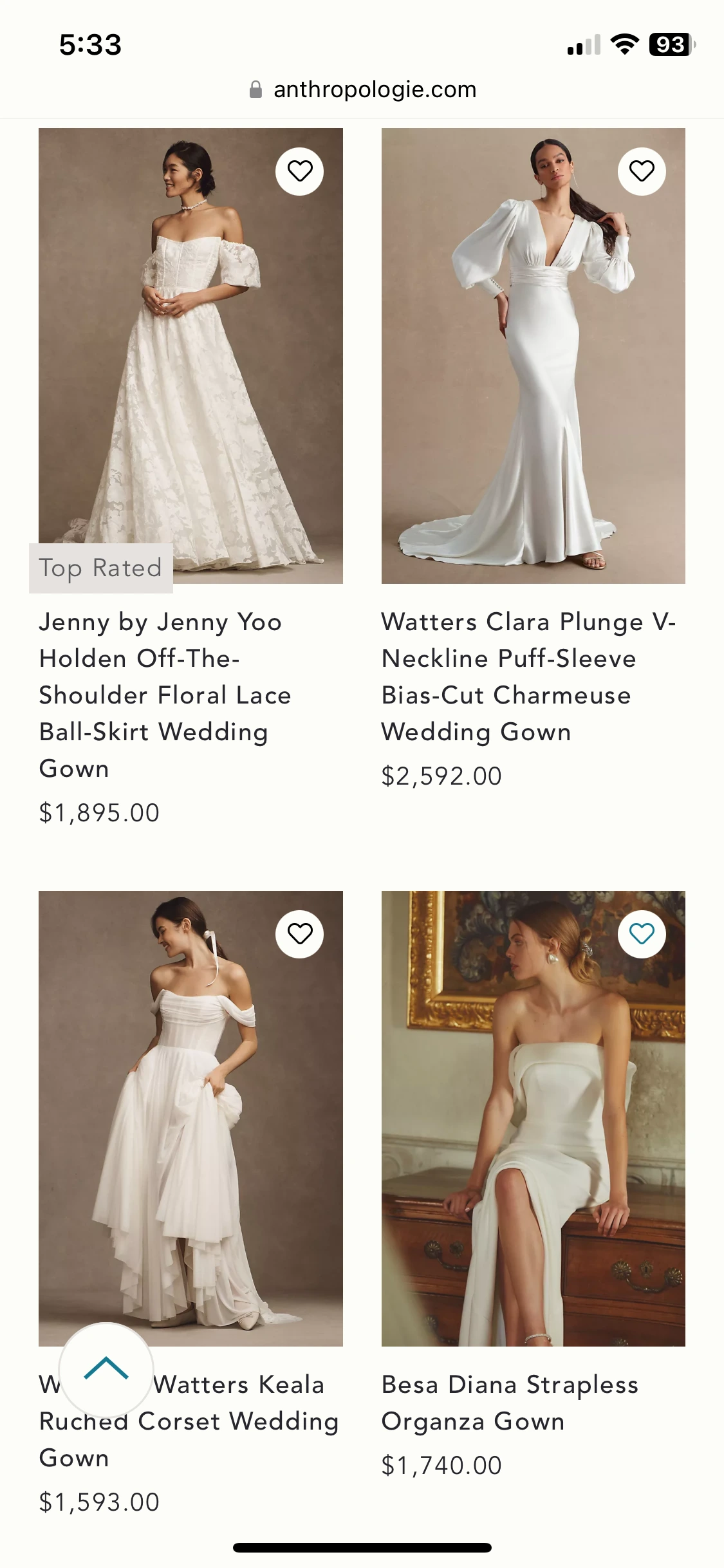 계속 검색을 하다보니 눈에 가장 띈 곳은 Anthropologie의 웨딩드레스. (그 때는 BHLDN 이라고 불렀는데 지금은 그냥 안뜨로폴로지 웨딩 이라고 이름이 바뀐 것 같다). 가격대가 900불 후반대 부터 3000불 정도 였고 모던, 보호 부터 트래디셔널 웨딩드레스까지 다양했다.