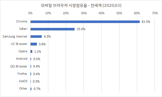 크롬이 65% 점유율로 단연 앞서며, 사파리가 25%로 또 다른 축을 이루고 있습니다. 삼성 갤럭시로 대표되는 삼성 인터넷과 중국 알리바바 그룹의 UC브라우저가 뒤를 이어 차지하는 모습에서 모바일 브라우저 시장의 지형도를 그려볼 수 있습니다.