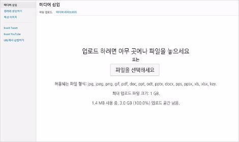 텍스트로만 구성되어 있는 게시물보다 텍스트와 이미지, 동영상 등의 여러 개의 미디어를 이용하면 게시물의 이해도를 높일 수 있습니다. 최대 업로드 파일 크기는 1GB(가입형 워드프레스인 경우)이며 한 번 업로드된 파일은 라이브러리에서 관리할 수 있어 편리합니다.
