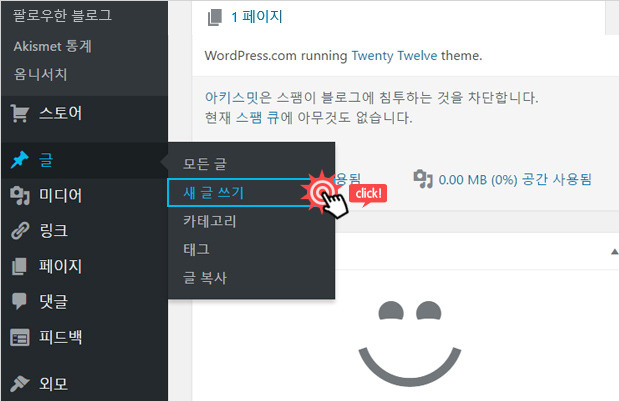 관리자 페이지에 접속했으면 왼쪽 ‘글’ 메뉴에서 ‘새 글 쓰기’를 클릭해주세요.