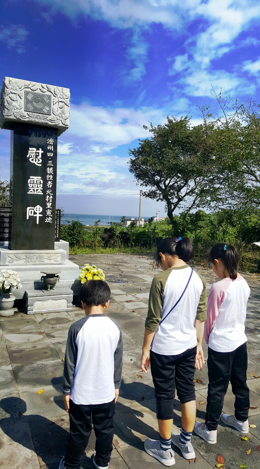 5학년 3학년 유치원생이 4.3 사건을 설명한 들 이해하겠나만은 우리 여행의 목표는 제주 4.3 사건을 위시한 역사투어였다. 차 안에서 열심히 설명했지만 장난치며 깔깔대기 바빴던 아이들이 너븐숭이 4.3 기념관 밖 위령비 앞에 서자 조용히 묵념을 했다.