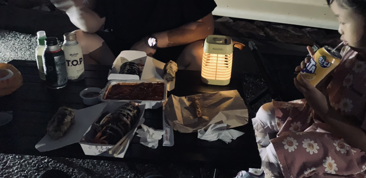 더운 날씨로 인해 평일에도 이곳은 인기가 있었다. 우리는 적당한 곳에 자리를 잡고 세팅하기 시작했다. 우선 의자 셋, 테이블 하나, 그리고 조명을 차에서 내려 자리를 만들었다. 그리고 준비해 온 음식을 테이블에 펼쳤다. 남편이 좋아하는 떡볶이를 뜯는 순간 무언가가 떨어졌다. 하늘을 올려다보았다. 빗방울이었다. 많이 오는 것이 아니라 그냥 먹기로 했다. 맛있게 김밥을 먹고 있는데 빗방울 수가 많아지기 시작했다.