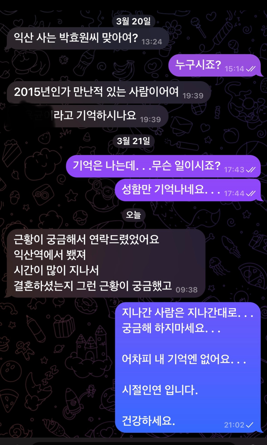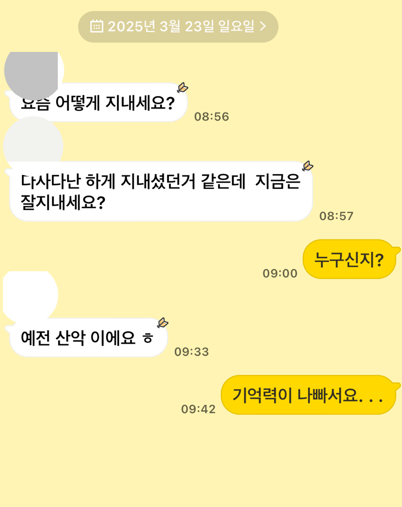 카톡에 기억도 없는 사람이 잘 지내냐고 메시지가 왔다.