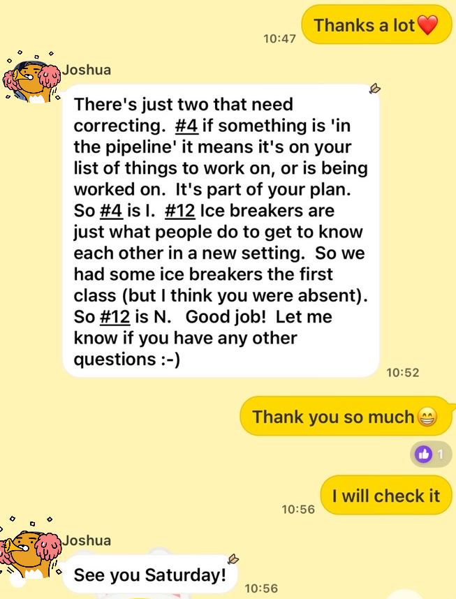 목요일에 받는 수업은 수준이 어느 정도 나와 맞고, 한국인 강사라서 그런지 한국말을 해도 강사와 소통에 어려움 없이 이해가 빠른 편이다.