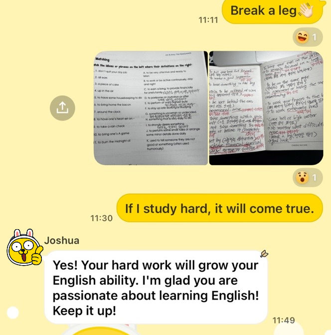 수업이 끝난 후 나는 외국인 강사 Joshua에게 수업 단계가 너무 높다, 하지만 나는 결석은 안 할 거다. 포기하지 않을 거야 약속해라고