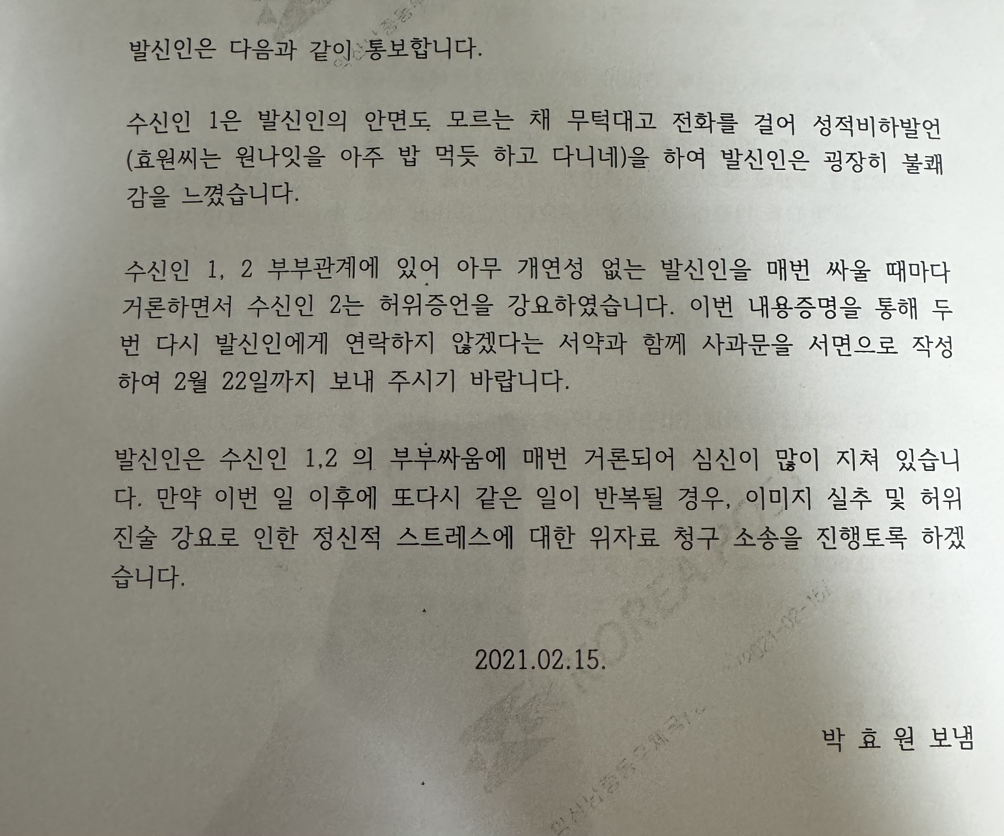 한 번만 더 근거 없는 소문을 발생시키거나 둘 사이의 문제에 나를 끼어들게 한다면 손해배상을 청구하겠노라고….