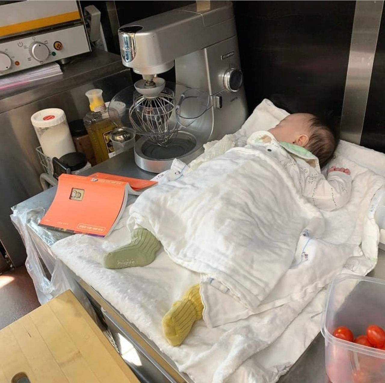 업무 중에는 유모차를 요리조리 굴려가면서 비좁은 주방의 가장 안전한 자리를 찾아 어떻게든 함께하려고 했다. 오븐 이외에는 불 쓸 일이 거의 없어서 다행이었다. 아직은 수유텀이 짧아 수시로 분유를 타 먹이면서 기저귀에 파란 줄이 뜨면 갈아주러 2층을 오르락내리락했다. 울고 보채면 안아서 달래고 잠들면 냉장고 위에 이불을 깔고 재웠다. 주문이 많아지거나 오븐을 돌려야 하면 유모차를 태워 주방 입구에 두고 카운터를 봤다. 전 인생을 통틀어 가장 힘들었던 일을 꼽으라면 고민 없이 아기가 태어난 후 100일 동안이라고 말할 것이다. 이 기간 동안은 거의 같은 질문들을 남편에게 쏟아냈다.