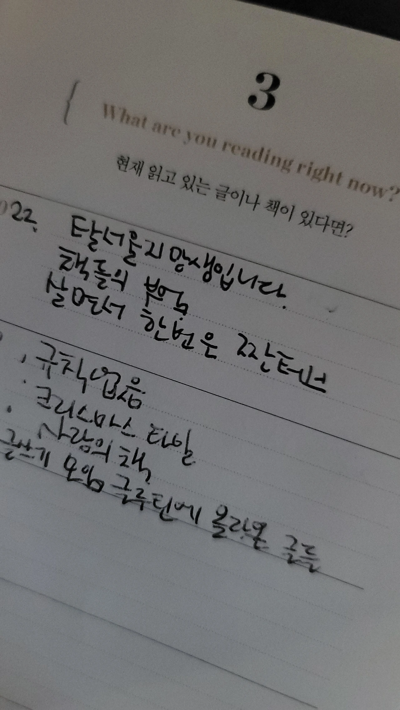 날마다 달라지는 질문에 매년 같은 날 답을 하는 형식인데 일기를 재밌게 쓸 수 있을 것 같아 바로 구입했다. 작년에 산 건데 날짜를 보고 쓴 게 아니라 마음에 드는 질문에 답을 해놓기도 했는데 지금 다시 보니 웃기고 재밌어서 다시 기록해보기로 했다.