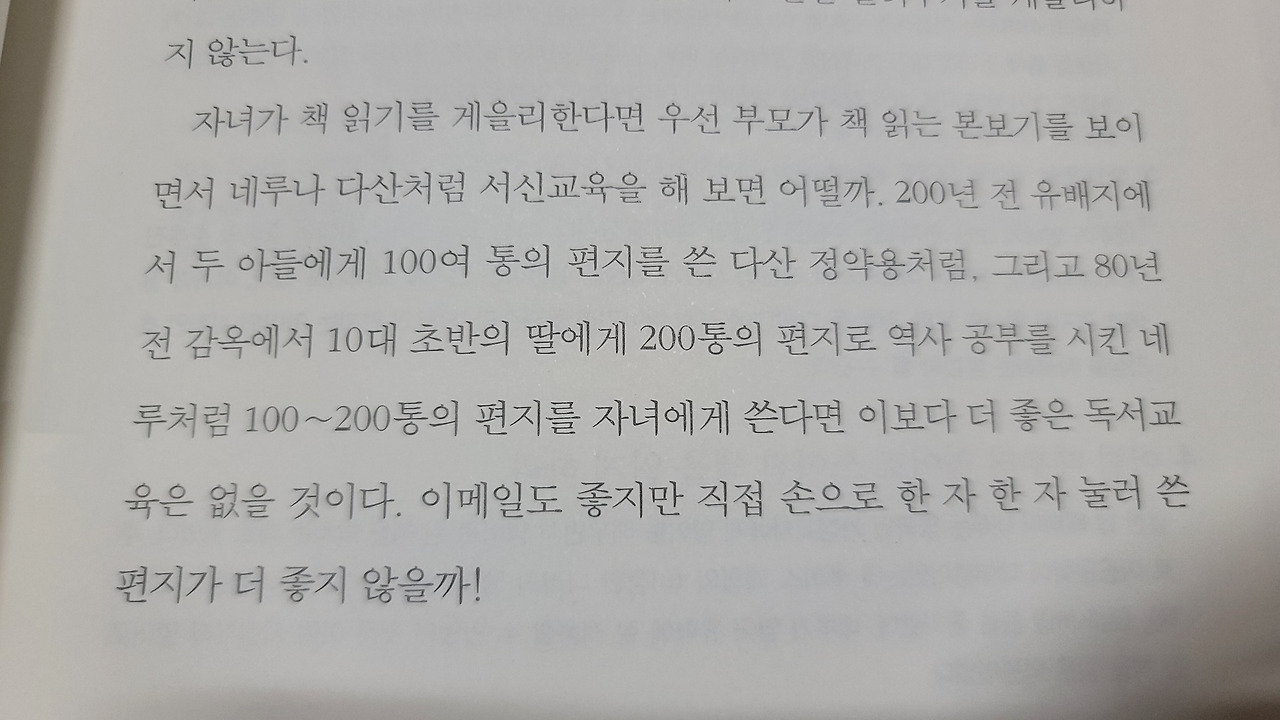특히 유배지에서 자녀에게 100통의 편지로 서신교육을 한 다산 정약용의 이야기, 감옥에서 200통의 편지로 독서교육을 한 네루의 이야기가 인상 깊고 따뜻했다.