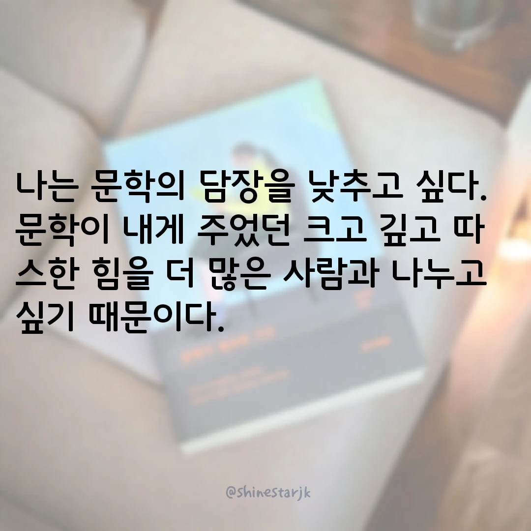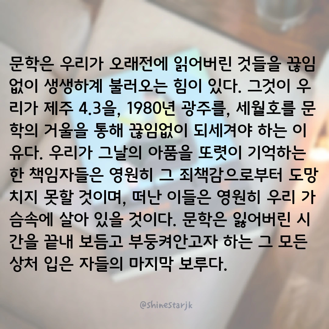 작가가 사회를 바라보는 관점이 어떤지 보여주었고 책 끝에 책을 쓰기 위해 참고한 문학작품들 리스트가 있어 얼마나 책 한 권에 품을 들였는지 느껴져서 감동했다.