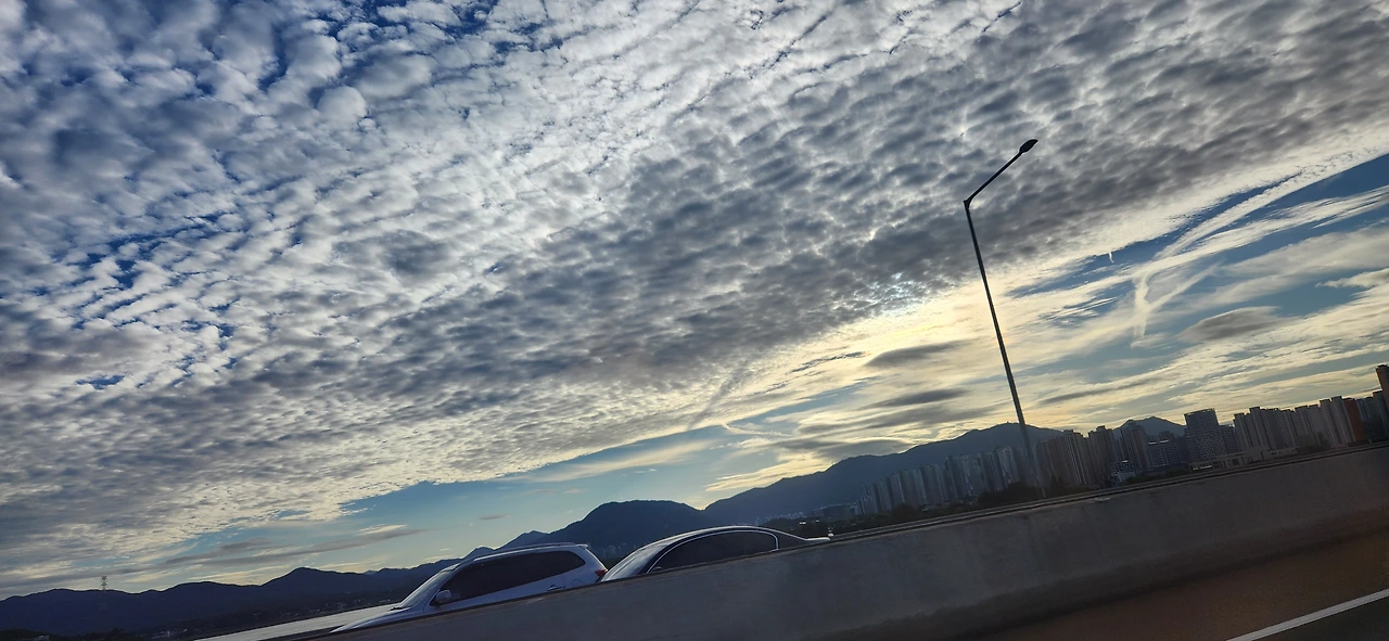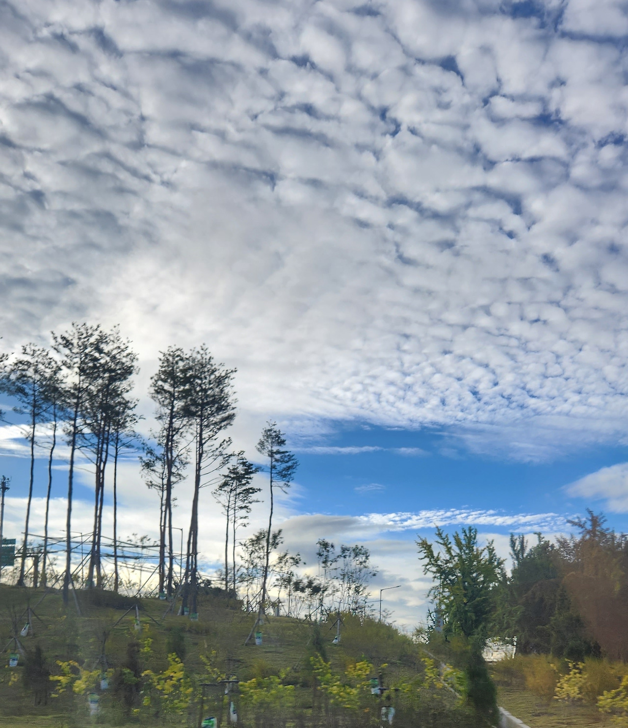 어제 그렇게 비가 퍼붓더니 오늘 아침 하늘은 솜뭉텅이를 깔아놓은 것처럼 제대로 가을 하늘을 보여주었다.