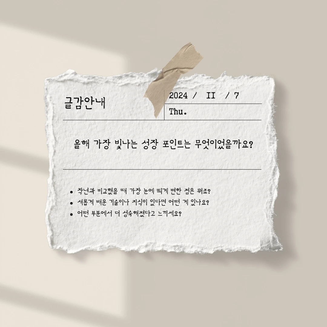 오늘 글감을 마주하면서 더 넓게 작년과 올해의 내 모습을 비교해 본 후 가장 성장했던 모습들을 글로 기록해 본다.