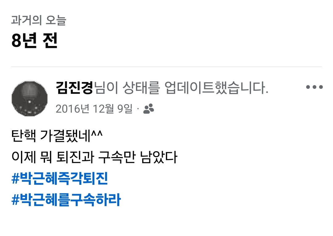 페이스북에서 뉴스기사를 보고 내 피드에서 과거의 오늘을 봤는데 8년 전 오늘 박근혜.탄핵이 가결되어 기쁘게 올린 글이 있었다.
