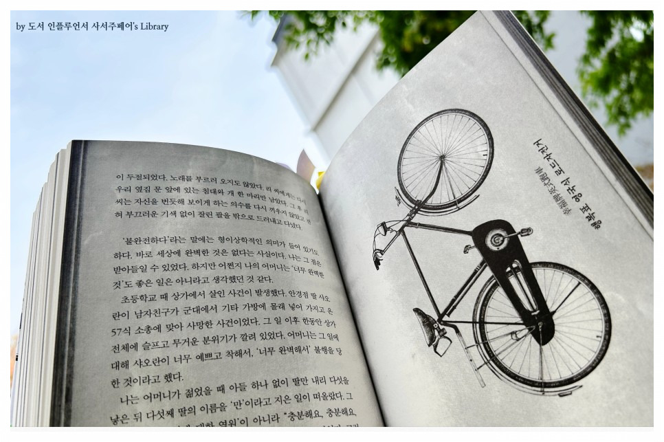 그때 우리는 마음껏 사랑할 수도, 마음껏 애도할 수도 없었지만, 지금 우밍이의 이 책을 읽는 독자들은 자신의 삶을 살고 있을 것이다. 작가의 전작 ≪수면의 항로≫을 읽은 한 독자에게 받은 편지를 계기로 시작된 자전거 찾기에서 청이 만난 자전거들은 우리의 삶과 많이 닮았다. 낡고 부서져 다시 길 위를 달릴 용기와 능력을 상실한 것, 브레이크장치가 부서진 것, 스포크가 녹슬어 무게를 지탱할 수 없는 것, 허브의 쇠구슬이 부드럽게 돌아가지 않는 것 등.(p.64)