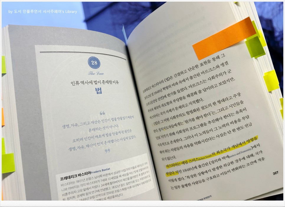 “사람들은 서로의 개인적인 자유와 재산을 보호하기 위해 연대한다. 그것이 본질적으로 법이 존재하는 이유의 전부다.”(p.308) 프레데리크 바스티아가 말하는 법의 존재 이유입니다.