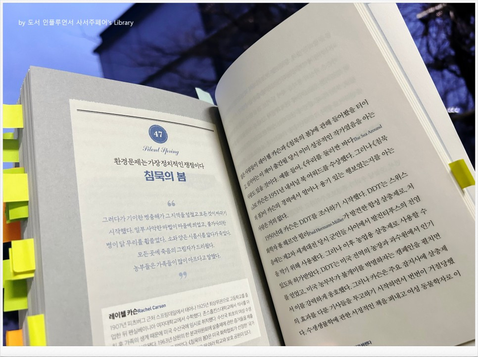 레이첼 카슨은 환경에 대한 인식이 미천하던 시대에 사람들과 정부, 기업 세력과 충돌을 겪으면서도, 자신의 생각을 책으로 펴내고 행동했습니다. 저자는 카슨을 “자연을 선의의 정치로 만드는 데 도움을 준 사람”이라고 평가합니다. 카슨의 행동은 지금 우리에게 시민으로서 역할에 대한 인식을 깨우치는 표본이 아닐까요?