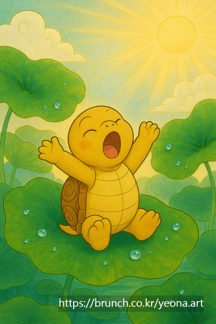 밤새 잠들어 있던 작은 거북이, 연아 거북은 눈을 살짝 뜨더니 하품을 하고, 두 팔을 쭉— 기지개를 켭니다.