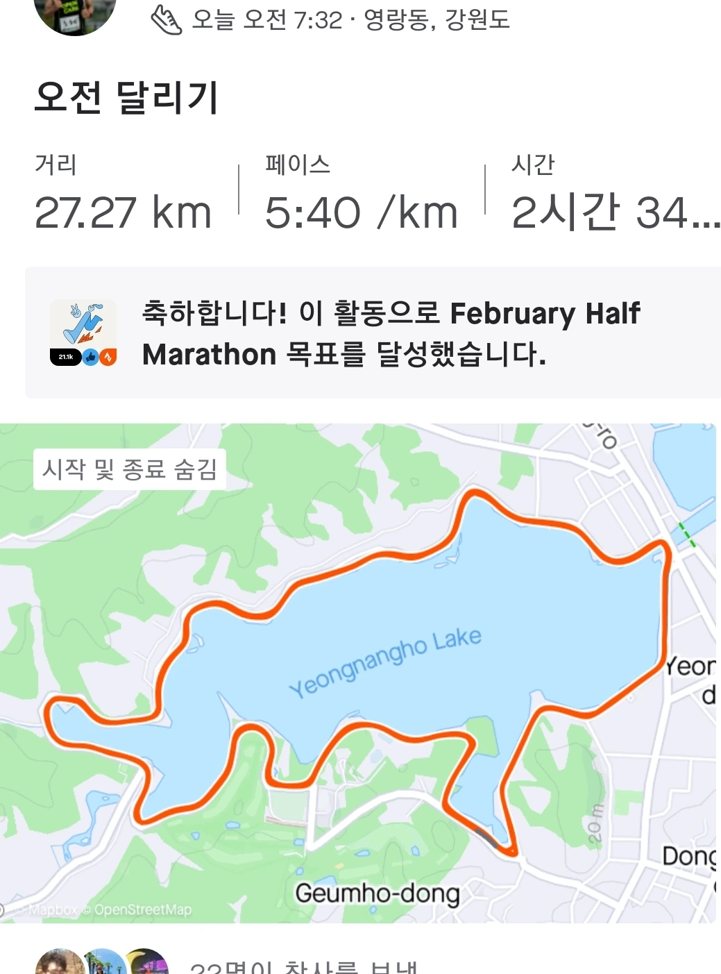 일요일 아침 7시경 영랑호 둘레길 4회전을 시작했다. 작은 정자 기둥에 물과 몽쉘통통 몇 개를 놔두고 주머니엔 에너지젤 시스 sis 베리맛 세 개를 넣었다. 27킬로를 달리는 오늘의 프로그램. 속도는 평소보다 조금 느리게 잡고 여유롭게 장거리와 긴 시간을 채우고 버티는 훈련이다. 전과 다르게 후반 처지지 않도록 초반에 속도와 케이던스에 집중했다. 다행히 오버하지 않고 한 바퀴를 잘 해냈다.