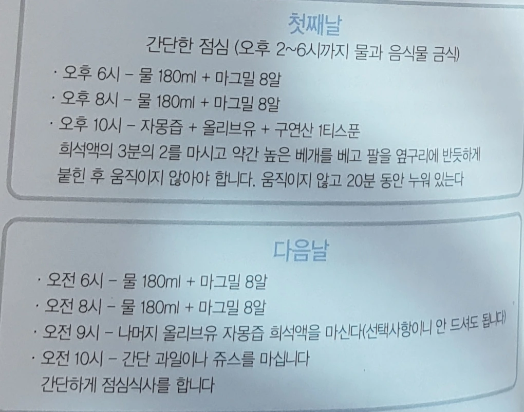 토요일 두시까지는 가벼운 식사를 해도 되는데 전 단식한다 생각하고 아예 물만 마셨어요. 집에 2시에 들어와 편히 쉬었어요. 6시, 8시 안내대로 물과 마그밀 8알을 먹었고 10시 '자몽즙 + 올리브유 + 구연산 1 티스푼'을 잘 섞어 2/3을 마셨어요.