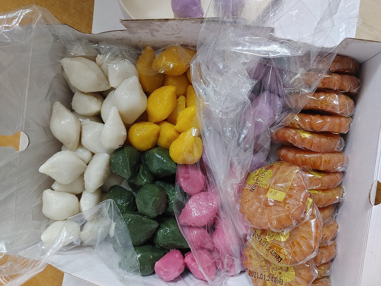 뜬금없는 생일 선물이기도 했지만, 그 선물이 꽃사슴 가족이라 의아했다. 더불어 떡 상자에 든 내용물을 보고는 웃음이 절로 나왔다. 오색송편 한 편에 켜켜이 놓은 약과 때문이었다. 달짝지근한 대추야자를 책상 위에 두고 사는 내 취향에 딱 맞는 떡이었다.